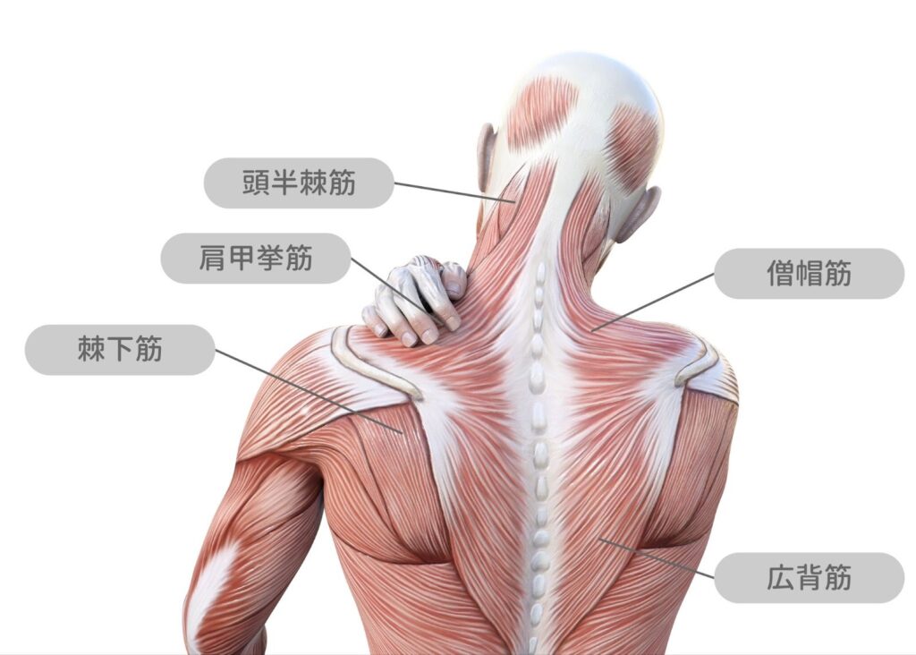 さらに、猫背や巻き肩の姿勢では肩が前方に引っ張られ、肩甲骨の動きが制限されます。この状態が続くと筋肉は硬くなり、肩の重さや痛みとして自覚されるようになります。肩こりは「不良姿勢の結果」として現れているケースが非常に多いです。