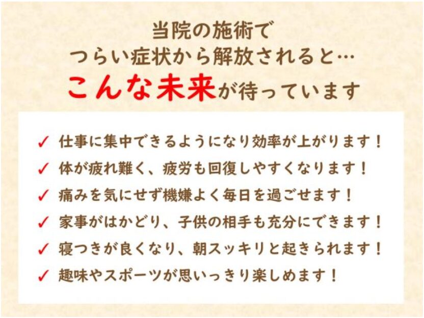 もし、あなたにこういったお悩みがあれば是非一度施術に来られてくださいね。