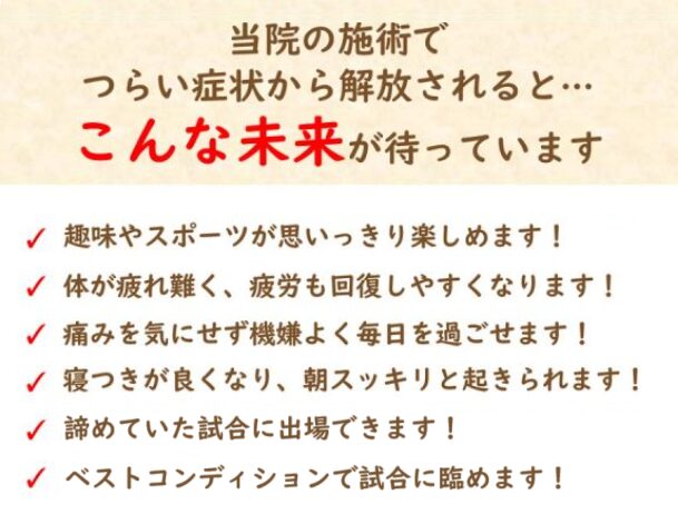 つらい症状が発生するたびにその場限りのマッサージや電気、湿布などの対処療法でごまかす習慣は卒業しませんか? 川西さくら整體院で施術を受けた方は症状の改善後に、このような未来が待っています。